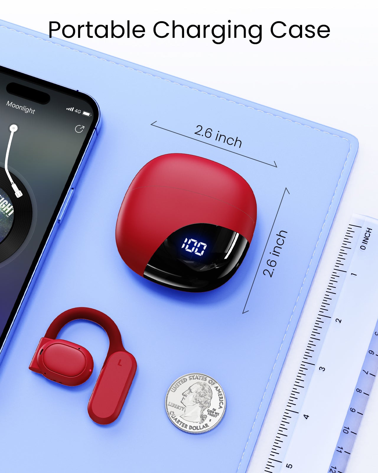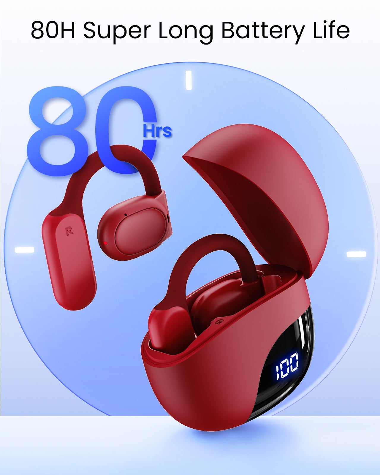 - 80 Hours Playtime and LED Digital Display: Each open ear earbud can play continuously for at least 13.5 hours on a full charge, and up to 80 hours with the charging case. Extra long battery life keeps you away from the hassle of frequent charging. In addition, the air conduction headphones case comes with an LED power display, so you can clearly know how much power is left in the case and whether it needs to be charged.